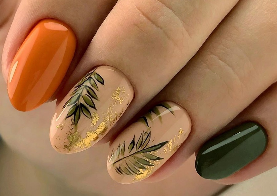 Să trecem la un design mai complex. Frunza de aur strălucitoare aplicată pe placa de unghii poate fi întotdeauna completată cu desen sau folosind o pânză colorată specială. Acest design nu va necesita mult timp și efort, dar în același timp va arăta vizual 100%. Un design pe care chiar și un începător îl poate face include: un strat de lac cu gel într-o singură culoare, aplicarea unei aplicații tematice colorate pe placa de unghii. O coardă finală reușită a acestei compoziții va fi o foită de aur ultra-modă, care poate fi plasată într-o manieră haotică pe placa de unghii.