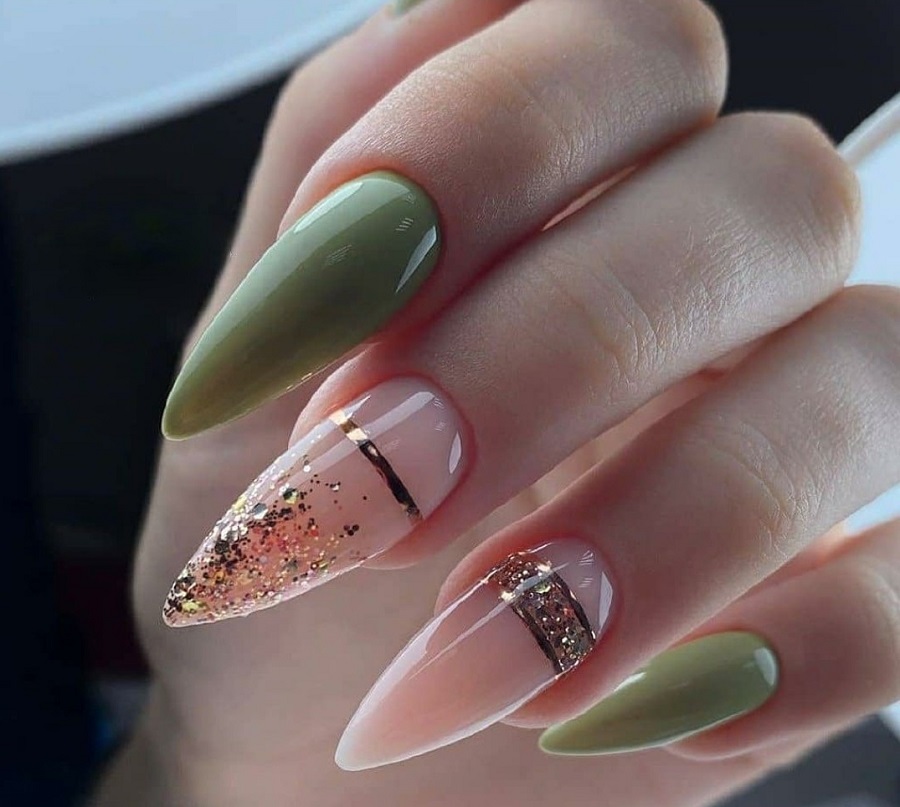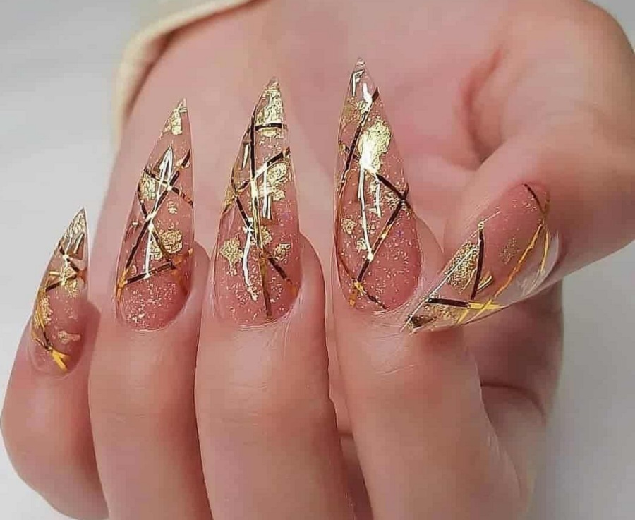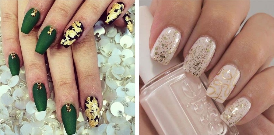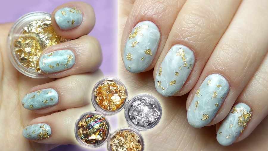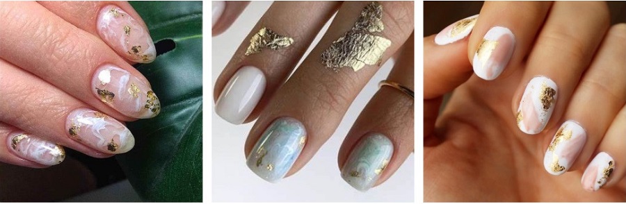 Astăzi, tema minimalismului a dispărut pe fundal, strălucirea și luminozitatea sunt prioritatea . De aceea, atunci când efectuează următorul design de unghii, maeștrii de artă a unghiilor pot folosi în siguranță sclipici și foiță de aur în același timp. Combinația acestor două materiale poate fi văzută în designul „marmură” pe lângă foile de aur, pot exista vene cu o strălucire remarcabilă. Cel mai adesea, strălucirile și foile de aur sunt combinate între ele în opțiunile de manichiură festive.