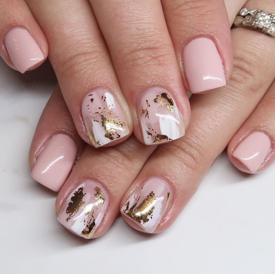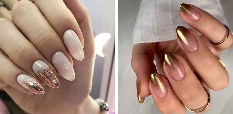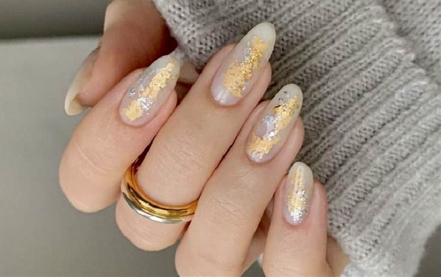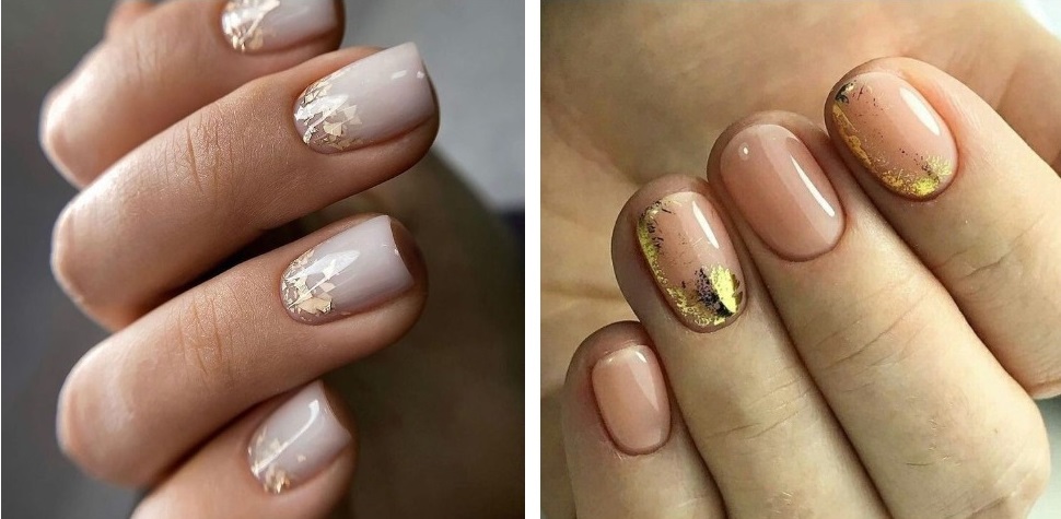 Foaia de aur este ideală pentru nuanțe pastelate și deschise de lac de gel. Recent, a existat un boom activ în manichiura bej, nud și alb, care poate fi transformată perfect folosind o cantitate mică de frunze de aur sau argint.