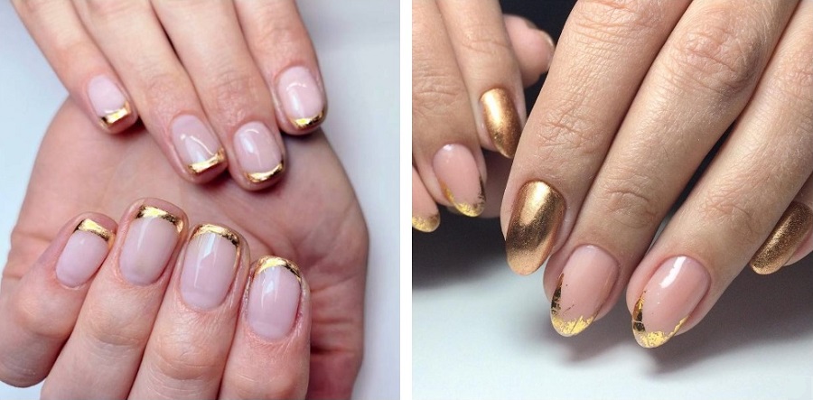 Cea mai simplă și eficientă modalitate de a crea un design de manichiură la modă implică utilizarea unei baze cu foiță de aur de diferite culori. O condiție prealabilă este un strat lipicios la bază, altfel frunza de aur nu se va putea lipi de placa de unghii.