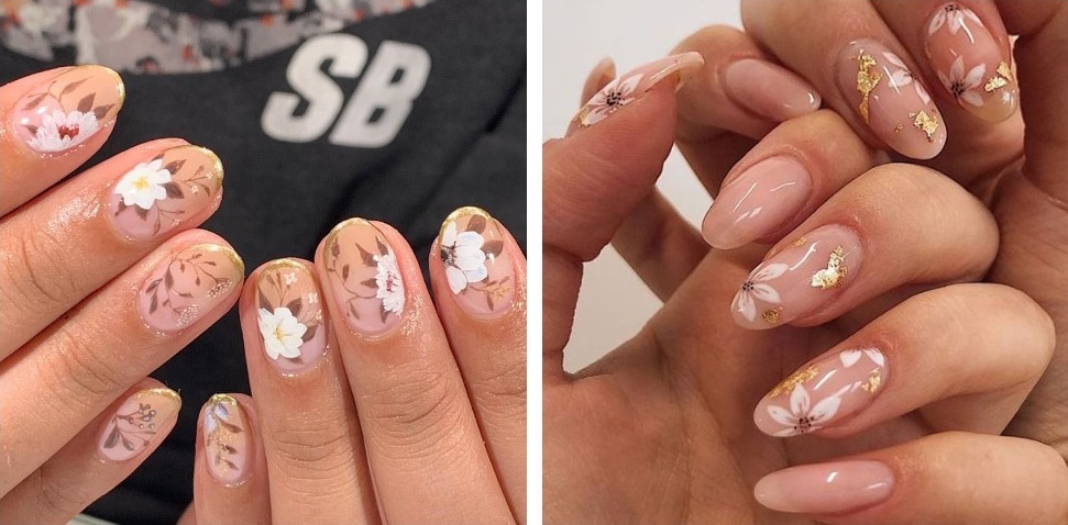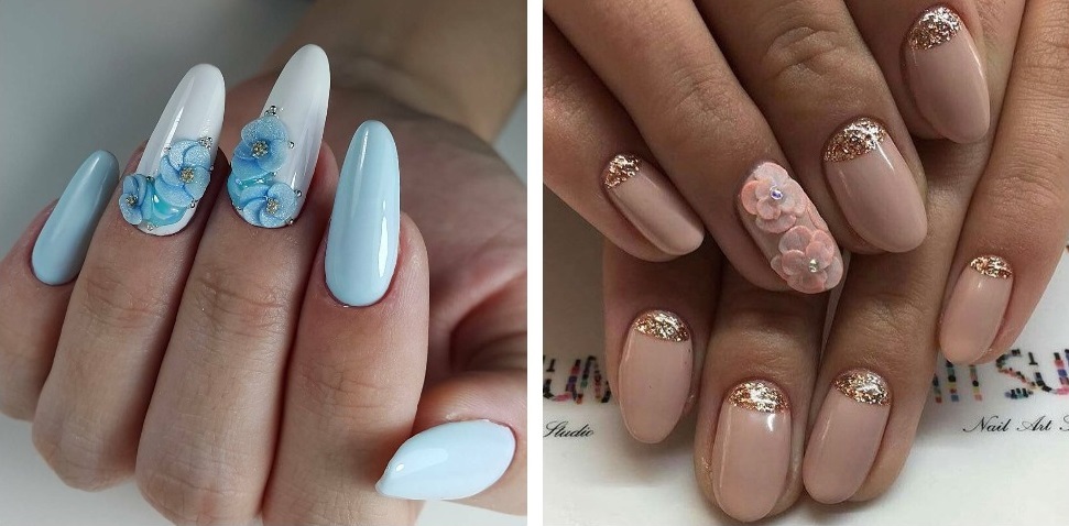 Manichiura cu flori 3-D realizate cu acrilic sunt bune de la sine, dar daca sunt modificate cu un mic fragment de foita de aur colorat. Primul lucru pe care trebuie să-l faceți este să obțineți o manichiură, să alegeți culoarea de bază potrivită și să desenați o floare acrilică pe placa de unghii. Când „imaginea” generală devine clară, puteți începe să utilizați folie. Cel mai adesea, artiștii de unghii folosesc foiță de aur pentru acest design. Potal poate fi folosit pentru a crea umbre, un fundal și poate fi folosit și pentru a adăuga cu ușurință textură și volum unei flori. Aici este important să nu exagerați, foita de aur este un material destul de insidios , fascinează prin strălucirea sa și se pare că nu este niciodată suficientă oprirea în timp este o regulă importantă pentru un nail artist.