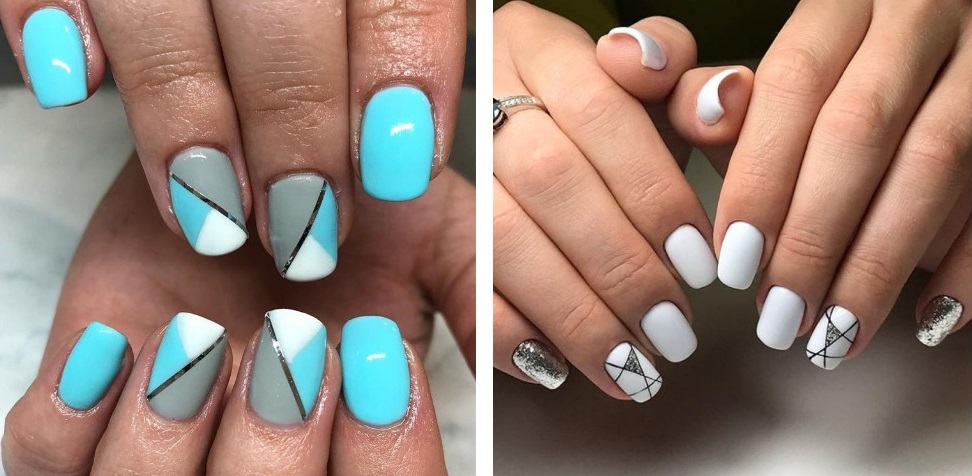 Designul geometric al plăcii de unghii este în tendințe de câțiva ani. Pentru fiecare zi, sunt potrivite o acoperire cu o singură culoare și o plasă contrastantă, care poate fi realizată folosind o pânză de păianjen sau un lac contrastant cu o perie subțire . Pentru a perfecționa acest design, adăugați doar o notă de strălucire cu foiță de aur multicoloră. Fragmentul strălucitor poate fi plasat pe orice parte a plăcii de unghii este de asemenea acceptabilă;