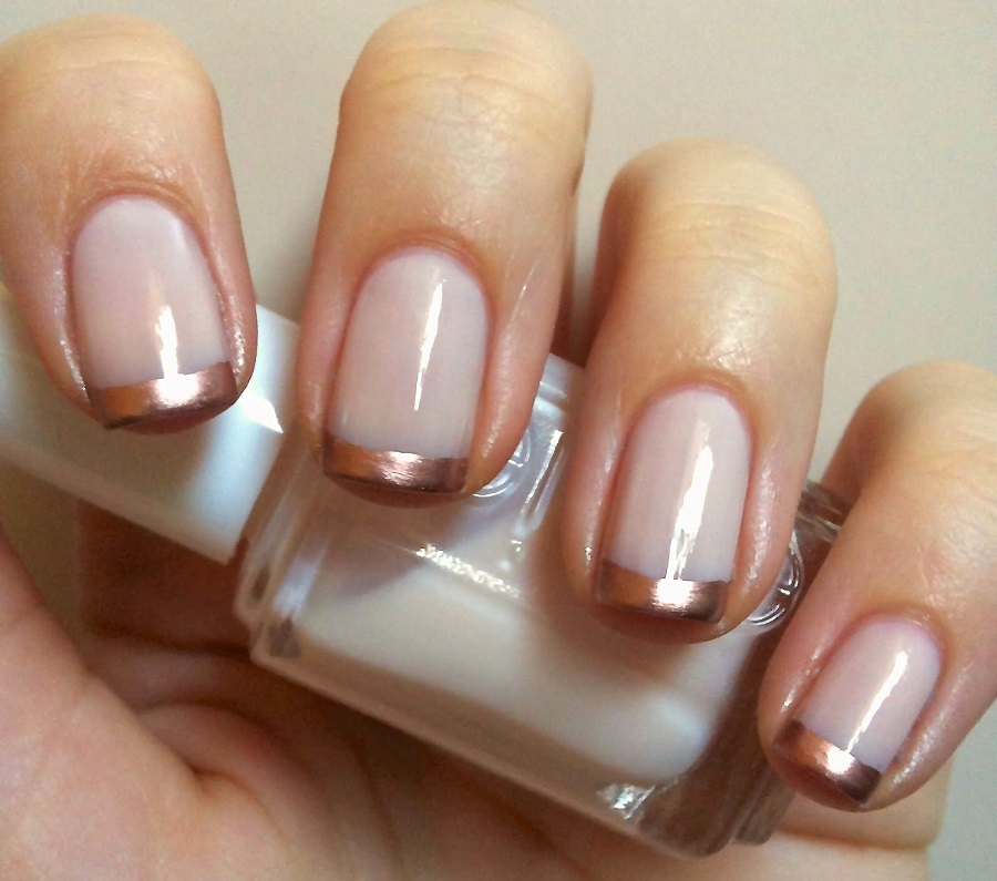 French cu foiță de aur este un design modern de manichiură care va atrage iubitorii de minimalism și laconism . Algoritmul pentru acoperirea plăcii de unghii cu lac de gel în acest caz este clasic.